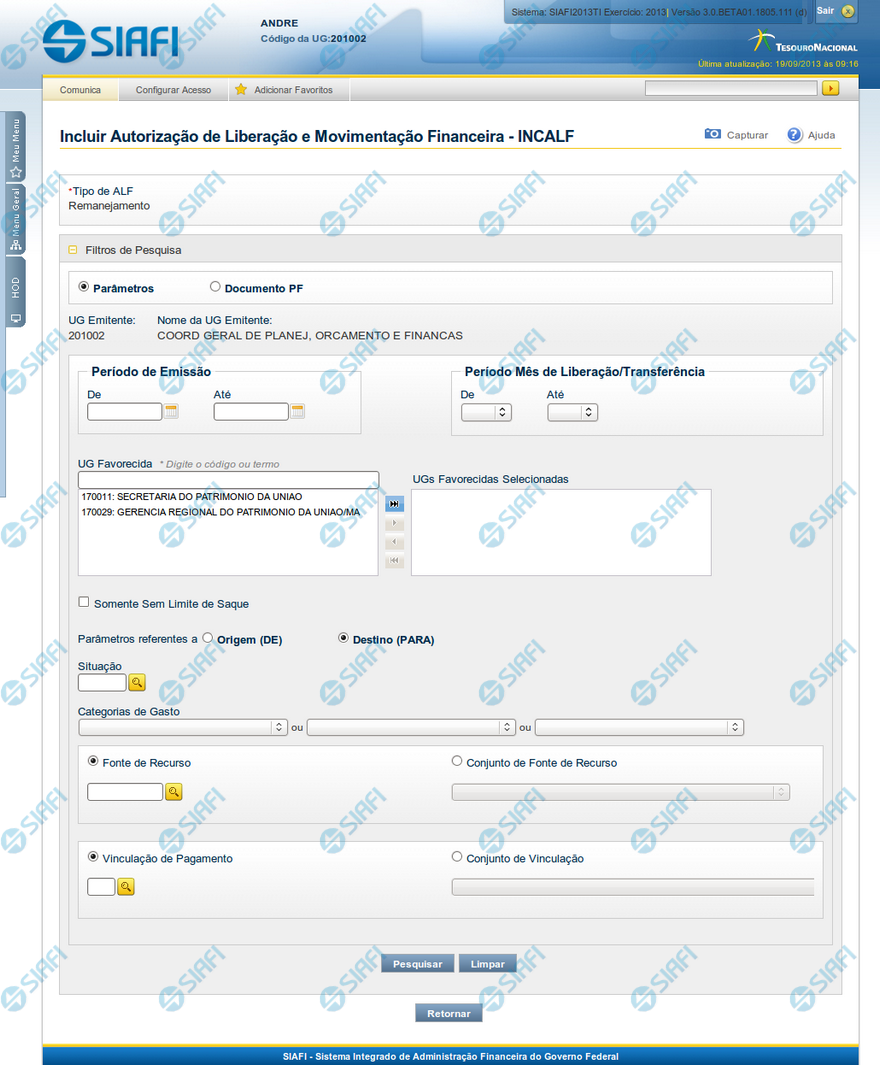 UGs Favorecidas disponíveis - Lista os códigos e descrições das UGs cadastradas que correspondem aos valores informados no campo UG Favorecida.