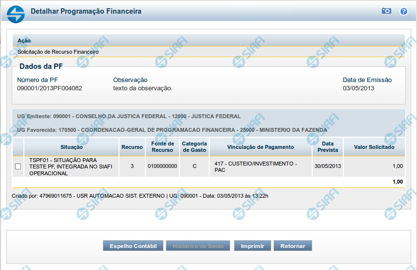 Para: nesta linha são apresentados os dados da Célula Orçamentária de destino dos recursos financeiros que compõem a Programação Financeira sendo detalhada.