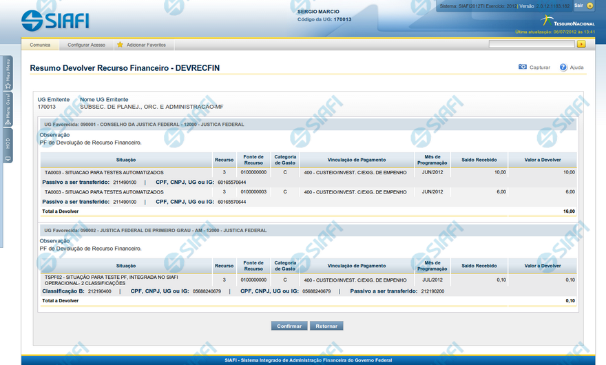 Confirmar - Clique nesta opção para iniciar o processo de contabilização da devolução dos recursos selecionados.