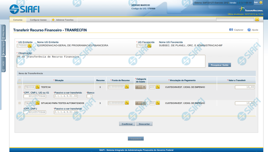 Esta opção somente estará disponível se houver pelo menos um item de transferência em edição e que tenha sido informado os campos UG Emitente, UG Favorecida e a situação do item.