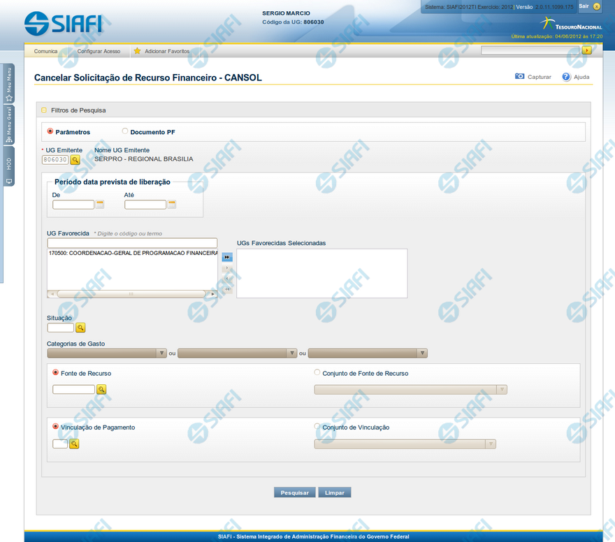 UG Emitente do Documento Pesquisado - Informe o código da UG Emitente do documento de Programação Financeira que contém a solicitação de recursos que deseja cancelar. Por padrão, o campo vem preenchido com a UG do usuário atual.