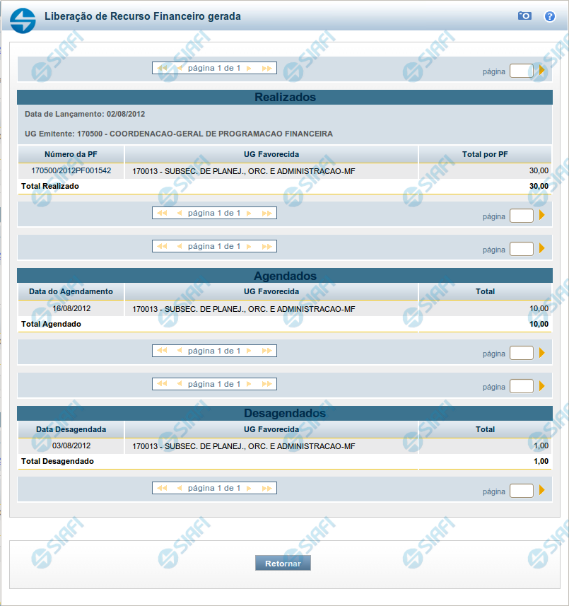1. Detalhes da liberação de recursos executada