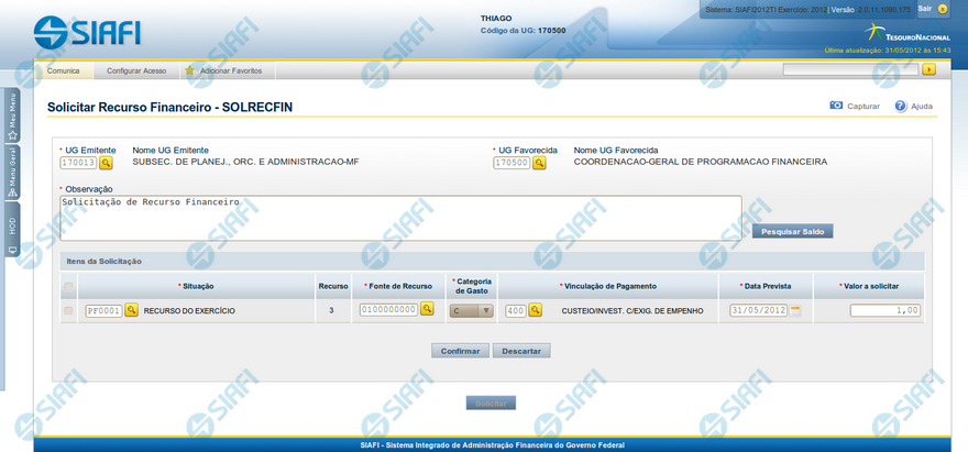 Solicitar - Clique neste botão para iniciar o registro da solicitação de recursos financeiros no sistema.