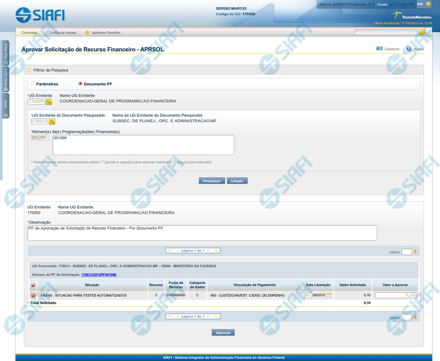 Saldo Solicitado - exibe o saldo do valor solicitado na Programação Financeira subtraído do Valor Aprovado e do Valor Cancelado da mesma solicitação.