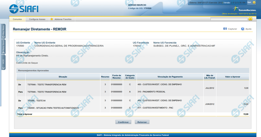 Observação - exibe os dados que comporão os documentos SIAFI que registrarão o remanejamento direto de recursos no sistema.