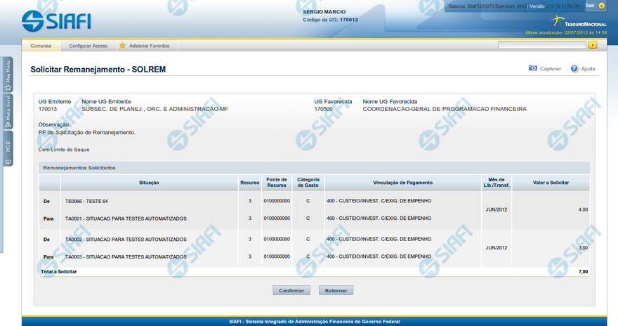 Confirmar - Clique neste botão para confirmar os dados informados, iniciando o processo de registro da solicitação de remanejamentos de recursos, que irá criar os documentos de Programação Financeira.