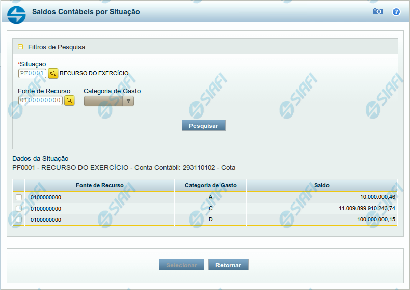 Saldo - exibe o montante disponível para a Fonte de Recurso e Categoria de Gastos da Situação pesquisada.