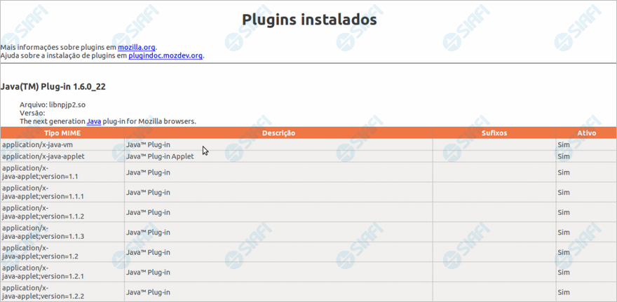 "about:plugins" na barra de endereços do seu navegador.