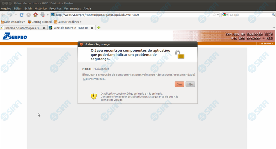 Caso a mensagem acima seja exibida, aceite a sugestão de bloqueio de componentes não seguros, clicando no botão "Sim".
