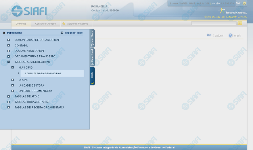 A seguir, acesse alguma funcionalidade oferecida no SIAFI Operacional e que requer, portanto, a intervenção do serviço HOD. O exemplo apresentado mostra a consulta à Tabela de Municípios, cujo acesso é feito pelo Menu "HOD", um dos três menus disponíveis para navegação no SIAFI Web.